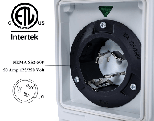 - EASY TO WIRE - 50 Amp power inlet box for generator power has color coded slots for the red, black,green and white wires.No problem putting the gauge wire in the connectors and the screws are sturdy enough to hold the wires securely.Turn on generator & good to go.